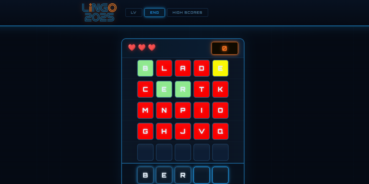 Browser-based word puzzle game inspired by Lingo game using HTML, CSS, and JavaScript, featuring a dynamic letter grid, scoring system, lives mechanic, language switching and a highscores leaderboard
